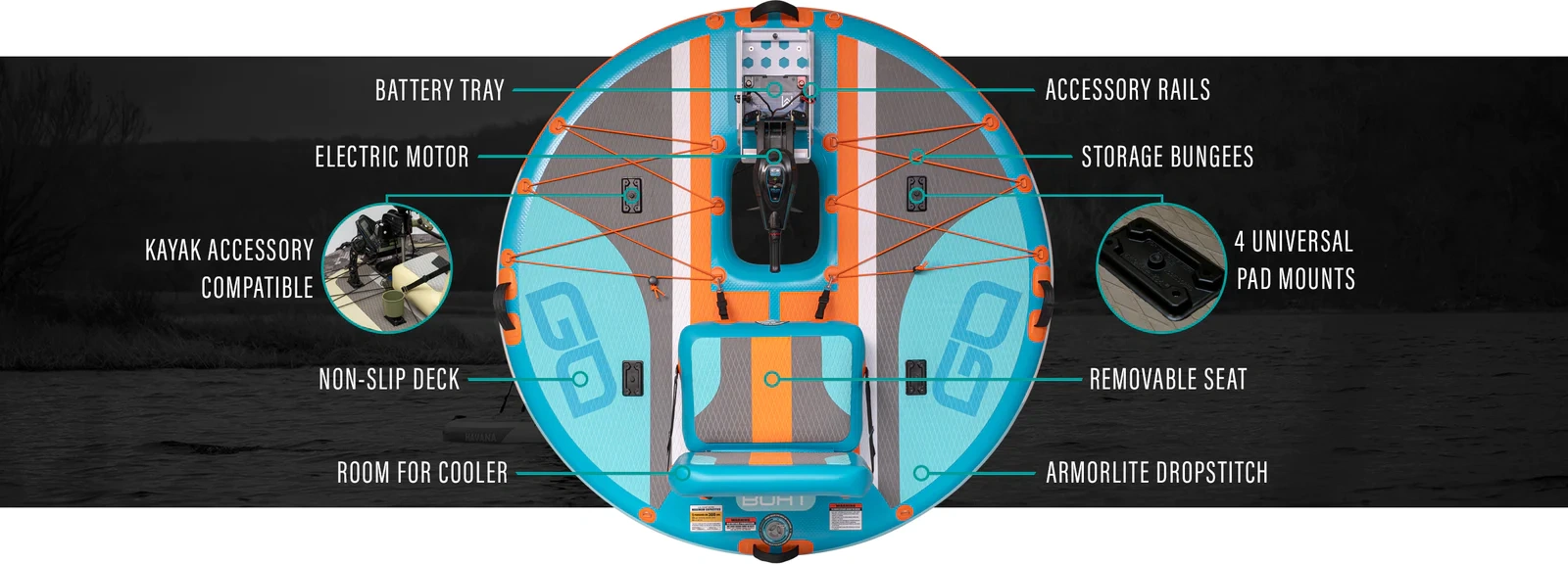 The GoBoat may be light and compact, but it packs a mighty punch. It's round design adds a level of stability you can't get in other watercraft. Stand up, walk around, we got you.